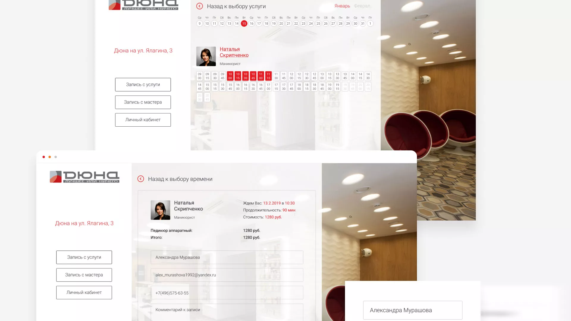 Такой инструмент, как онлайн-запись позволит клиентам записываться в салоны красоты в Невинномысске самостоятельно, в любое время суток, будь то раннее утро или поздний вечер, так как интерфейс сервиса интуитивно понятен и удобен каждому клиенту. А для салона — это возможность принимать заявки в режиме 24/7.